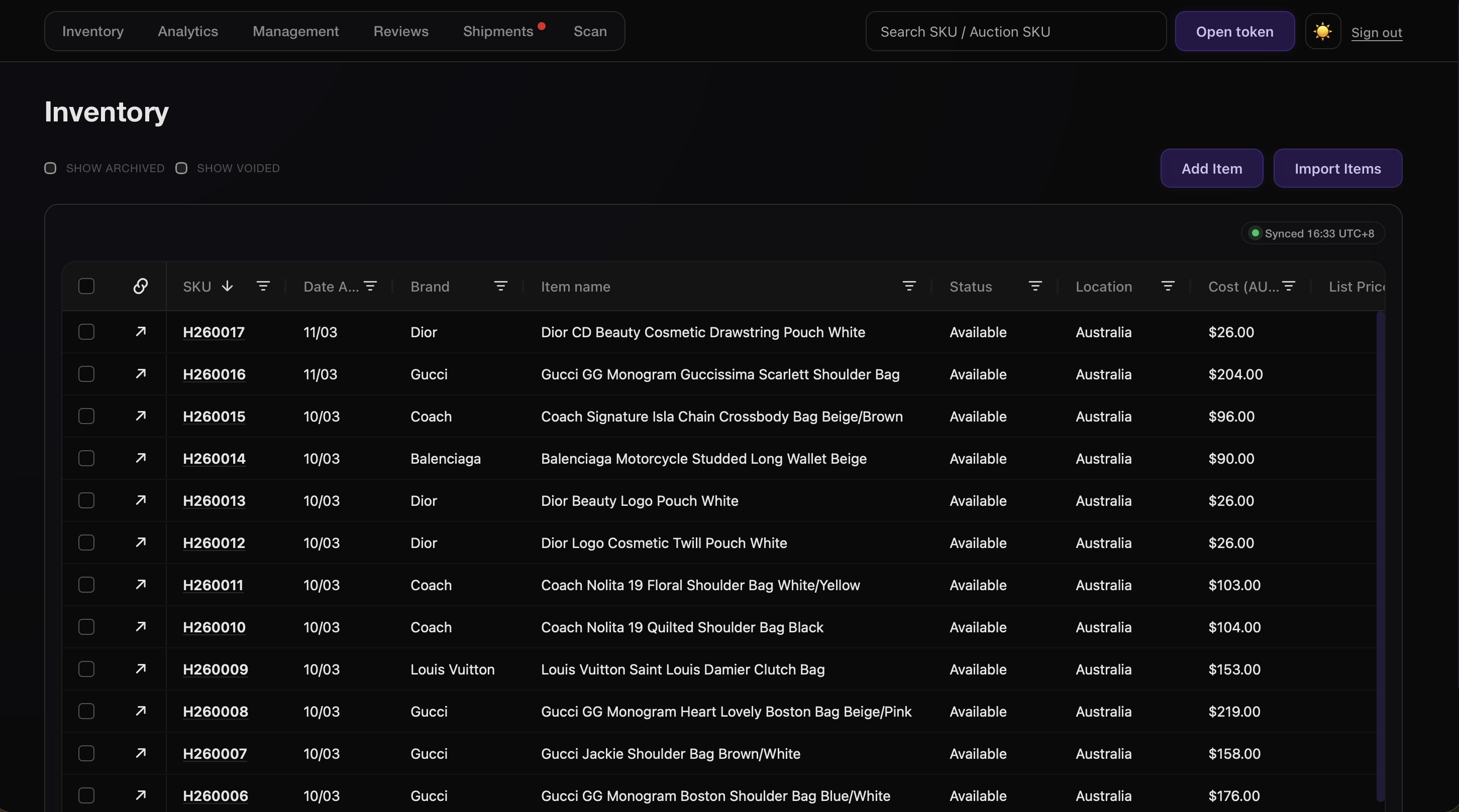Every item gets a unique SKU, QR token, images, pricing, and complete change history. Not a row in a spreadsheet — a complete record.